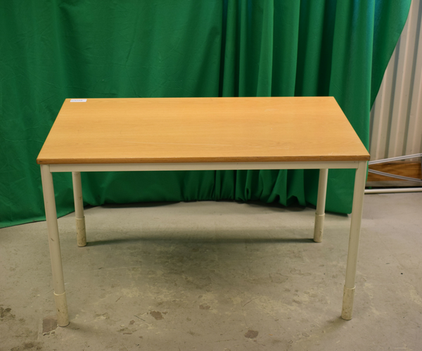 Beskrivning: Bord i trä med vita metallben. Kinnarps. Manuellt höj- och sänkbar. Finns repor och märken, är i bruksskick. Mått: D=70, B=120, H=68-80 cm. Artikelnummer: 10098. Lagerplats: A5A1.
