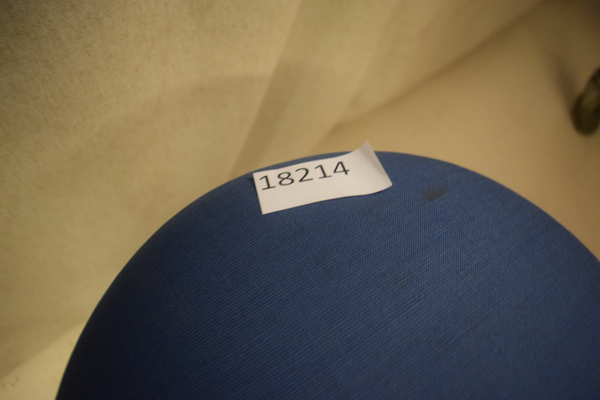 Ställbar pall med blå sits. Har repor och märken. Diameter 36 H65