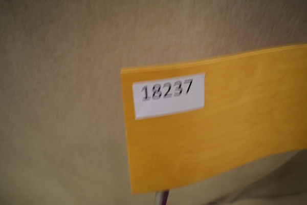 Stol med rosa tygsits, och med ryggstöd i trä, benen i metall. Finns repor och märken. D41 B39 H46