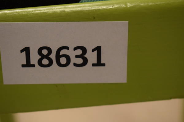 Grön trästol med mönstrad sittkudde. D54 B48 H93 H(sitt)47