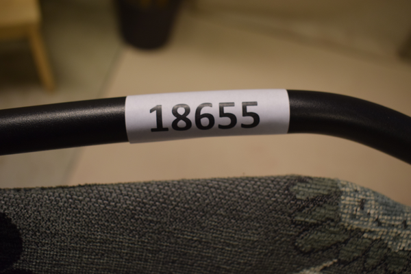 Stol i grått tyg med blommigt mönster och svarta metallben. D46 B44 H82 D(sitt)42 B(sitt)39 H(sitt)44