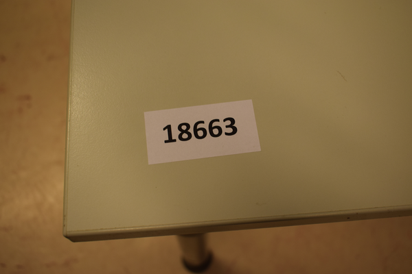 Ljusgrått bord i trä med metallben. D80, B80, H72