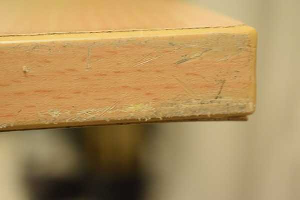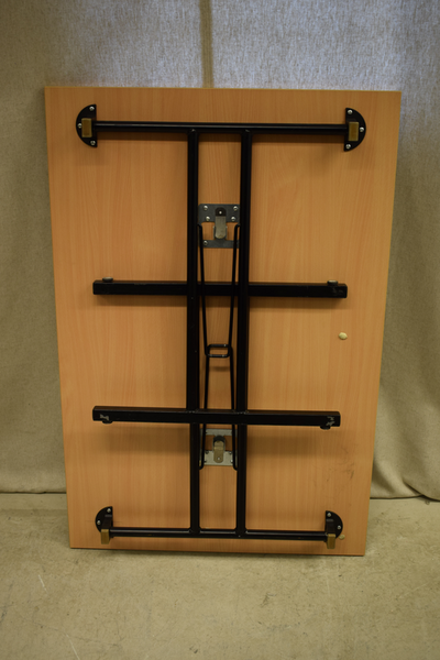 Fällbart bord, skiva i bok, svarta metall ben. Finns repor och märken, är i bruksskick. Mått: D=80, B=120, H=75 cm.