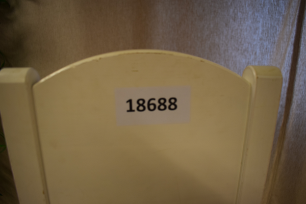 Vit barnstol i trä. Finns repor och märken. D29, B28, H55, H(sitt)29