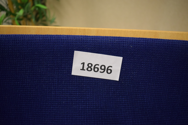 Trästol utan armstöd med metallben. Har sittkudde och ryggstöd i blått tyg. D52, B46, H88, H(sitt)44.