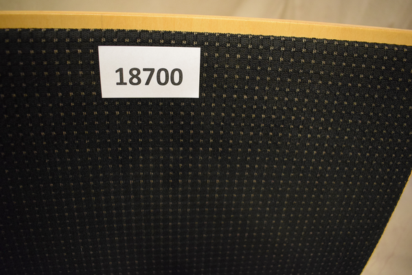 Trästol med svart tyg, armstöd i trä och metallben. D54, B54, H87. D(sitt)44, B(sitt)40, H(sitt)46.