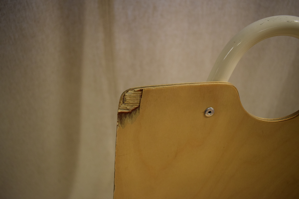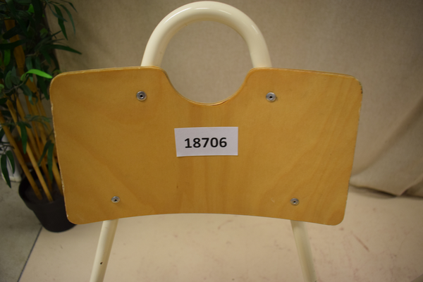 Hög stol med fotstöd, som har sits och ryggstöd i trä, och med metallben. Finns lite skador på vissa av stolarna som du kan se på tredje bilden. D47, B41, H97. D(sitt)37, B(sitt)36, H(sitt)58,5, H(högst upp på ryggstödet)91