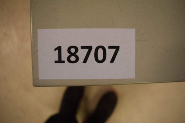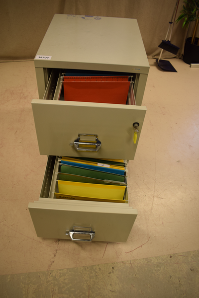Arkivskåp i metall med 2 lådor. Hängmappar finns. Finns också nyckel. Finns repor och märken. D64, B53, H71.