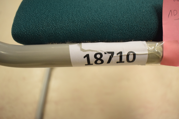 Stol med sits och ryggstöd i grönt tyg, har metallben. D53, B48, H80. D(sitt)45, B(sitt)42, H(sitt)44