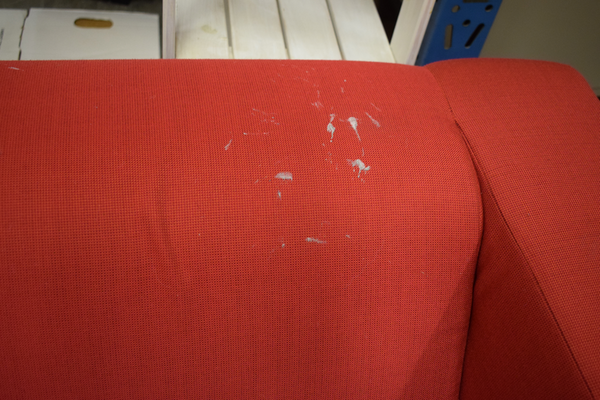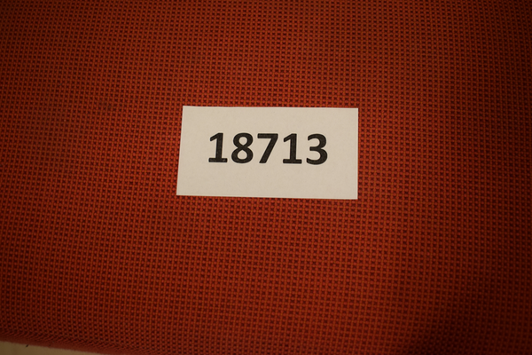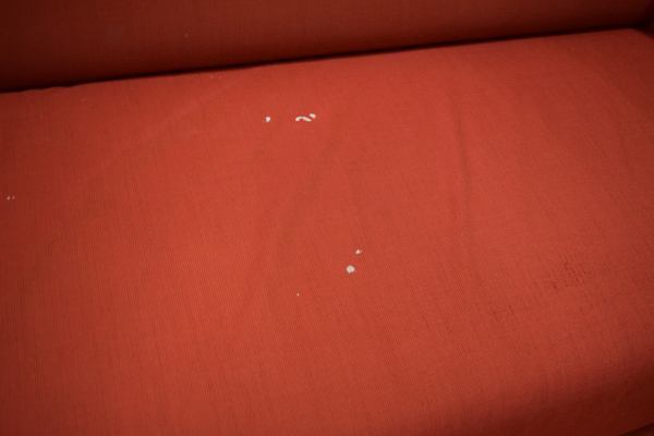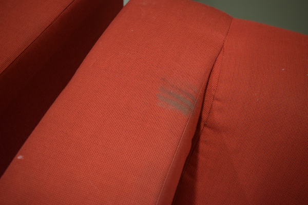 Röd soffa i tyg med trä ben. Har lite märken, se bilderna, några soffor har lite mer andra lite mindre. D86, B172, H65.