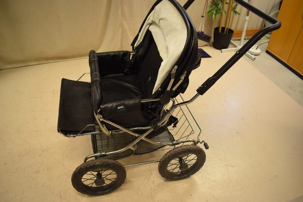Barnvagn i svart konstläder, Märke brio. Har hjul som går låsa. D107, B75, H98.