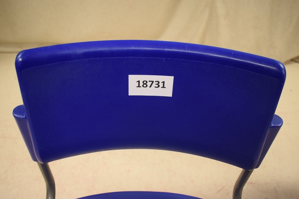 Stol med sits och ryggstöd i blått plast, ben i metall. Finns repor och märken. D49, B48, H76. D(sitt)40, B(sitt)42, H(sitt)42.
