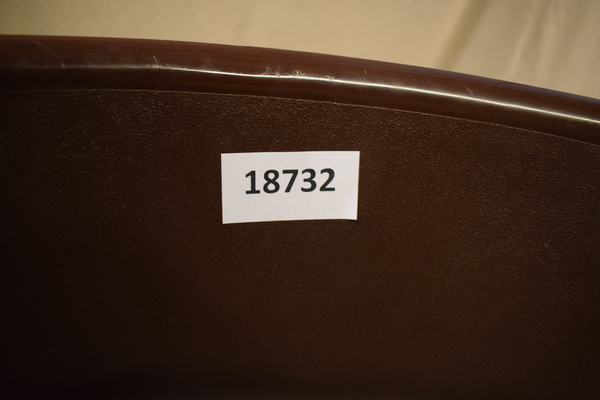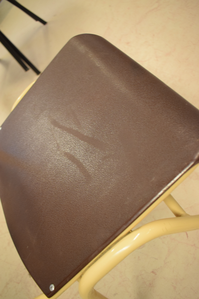 Stol med sits och ryggstöd i brunt plast, ben i metall. Finns repor och märken. D49, B48, H76. D(sitt)40, B(sitt)42, H(sitt)42.