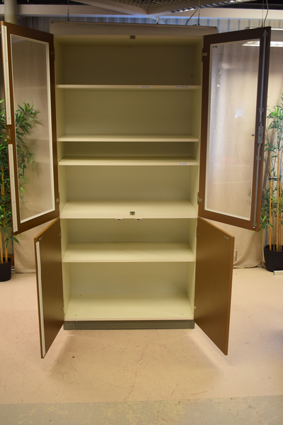 Vitt skåp med bruna dörrar. Har 6st hyllplan. D47, B100, H210