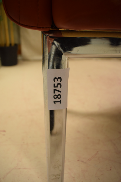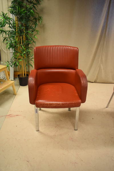 Röd skinnstol med metallben. ganska slitet; framför allt enutav stolarna. B:60 D:52 H:90 Sitthöjd:46