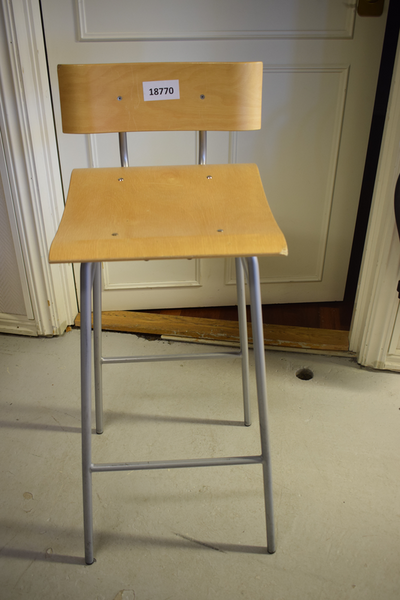 Hög stol med sits och ryggstöd i trä. Metallstöd med fotstöd. Sitthöjd: 77. B:37 D:37 H:97