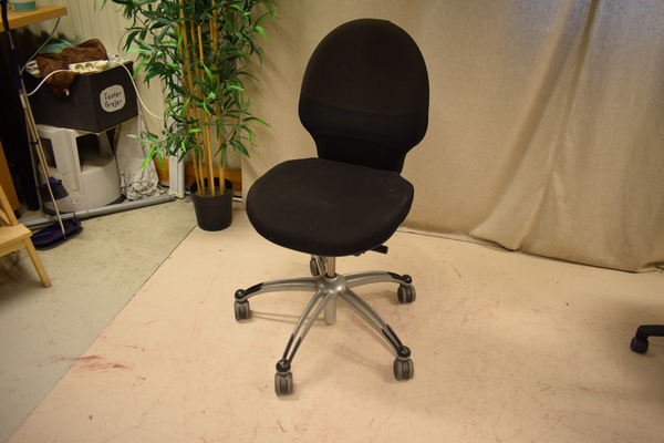 Svart kontorsstol. Höj- och sänkbart. Sitsen går att skjuta fram och bak. Lutbart ryggstöd. Nackstödet saknas. B:67 D:47