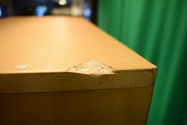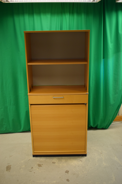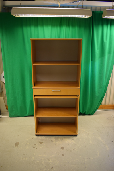 Skåp I trä. 2-delat med jalusi nederst. 2 hyllplan i jalusidelen. Nyckel finns inte. Kinnarps. En låda. Hylla i överdel med 2 hyllplan. Skada upptill på höger sida. Finns repor och märken, är i bruksskick. Mått: D=40, B=80, H=177 cm.