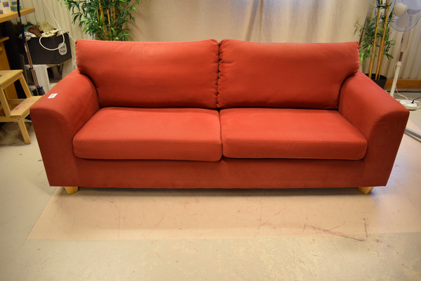 Röd tygsoffa med 2 sitsar. Sitthöjd:65 B:210 D:85 H:83