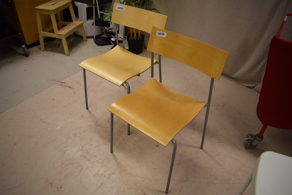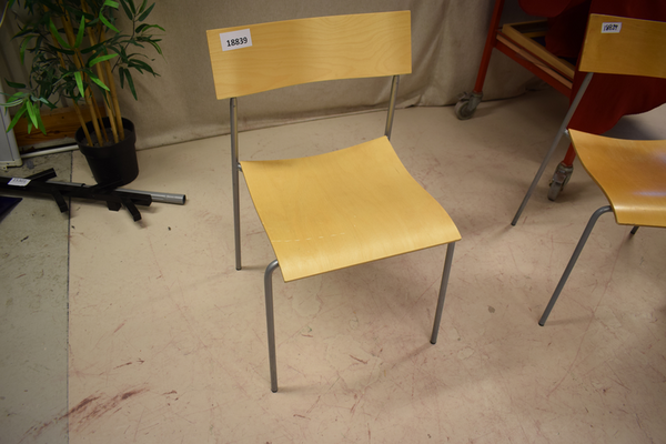 Trästol med metallben. Märken och repor finns. B:47 D:40 H:76