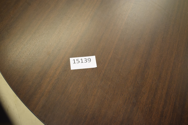 Runt träbord, brunt. Finns repor och märken. Diameter 150, H75.