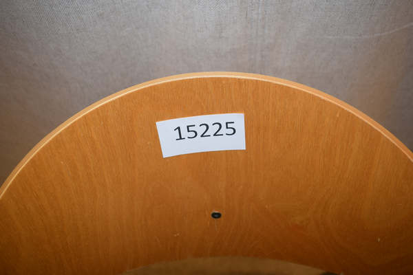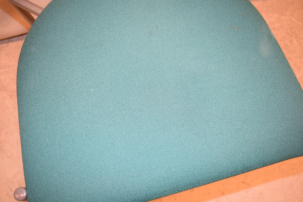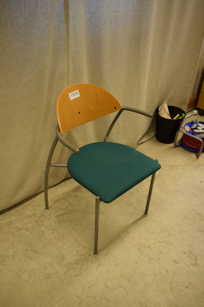 Stol med grön tygsits, träryggstöd och metallben. FInns repor och märken. D48, B52, H78, H(sitt)45.