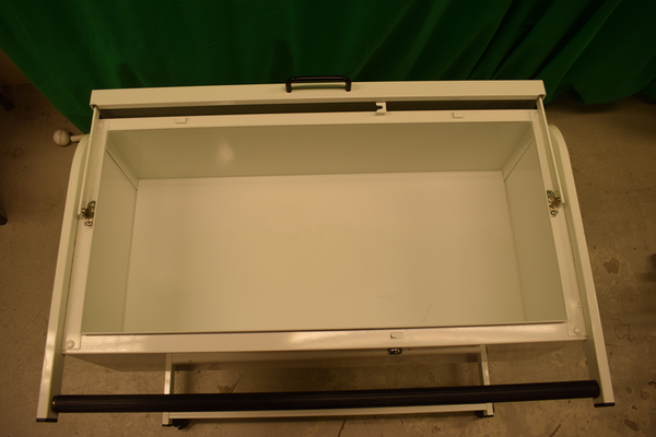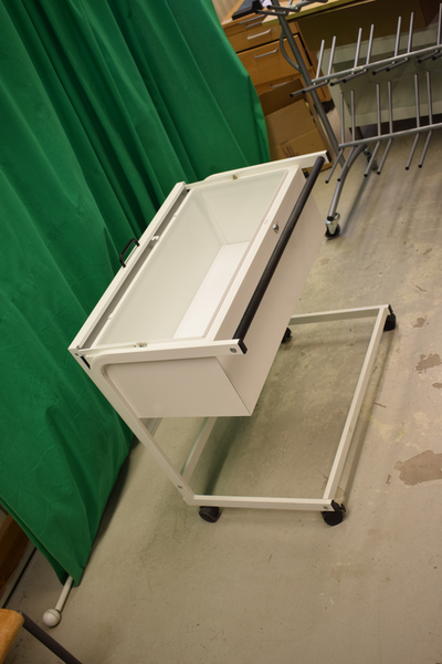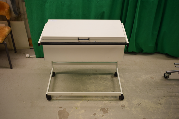 Beskrivning: Mappskåp i vit metall. Har hjul där ett hjul är låsbart. Svart handtag. Nyckel saknas. Finns märken, är i bruksskick. Mått: D=48, B=79, H=73 cm. Artikelnummer: 11433.