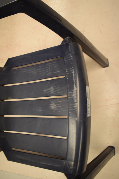 Plaststol i blå färg. Är i använt skick. Finns repor och märken. D54, B62, H98, H(sitt)44.