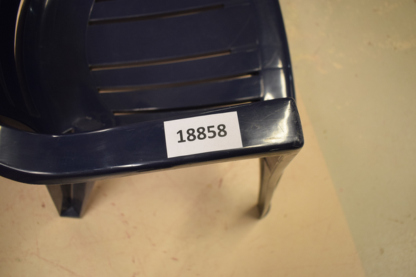 Blå plaststol. Använt skick. Finns repor och märken. D54, B58, H89 H(sitt)44.