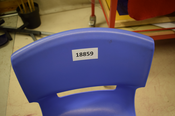 Blå plaststol. Låg sitthöjd. Finns repor och märken. D44, B42, H70, H(sitt)39.