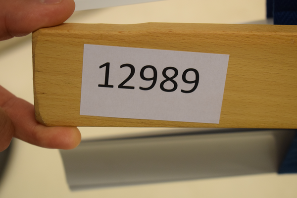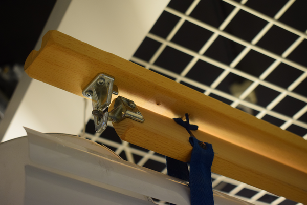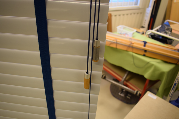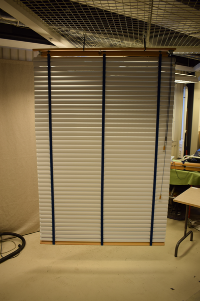 Persienn med träram. Blå snören och band. Har vita lameller. D6, B137, H202.