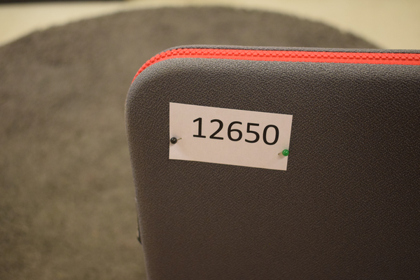 Grå bordsskärm, med röd dragkedja. B180, H65.