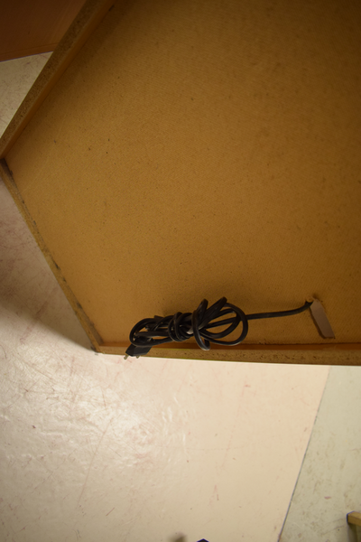 Skåp, med 2 glashyllor och saknar dörr. Har en lampa inuti skåpet, där man har borrat ett hål på baksidan av skåpet, se andra bilden. D42,5, B39, H94,5.