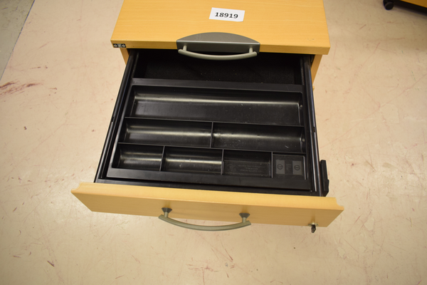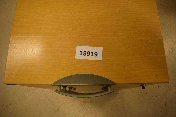 Hurts i trä med hjul. Har 3 lådor och nyckel. Finns repor och märken. D65, B43, H52