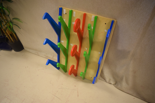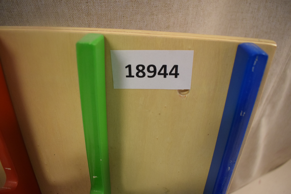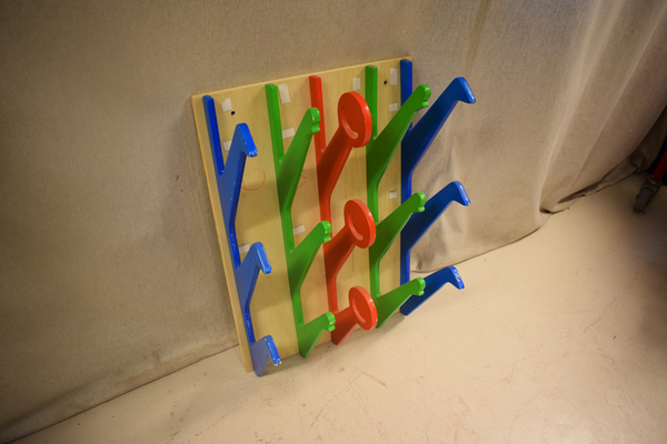 Flerfärgad sko/stövelhylla. Röd, grön och blå färg. Är i använt skick, finns repor och märken. D26, B50, H72.