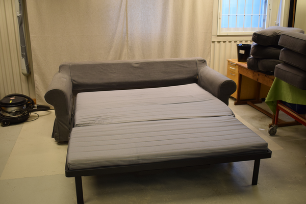 Beskrivning: Grå 3-sits bäddsoffa i tyg. Finns repor och märken. Fläckar finns. Kan behöva en tvätt. Mått: D=102/235, B=223, sitthöjd=49 cm. Artikelnummer: 13775