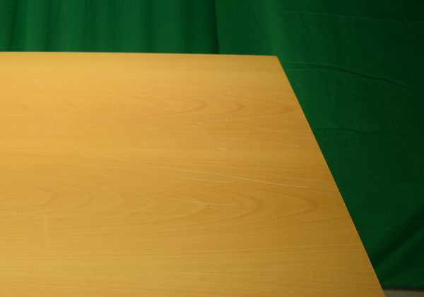 Bord med rundad sida i bokfaner, har manuell justerbar höjd. Har repig skiva, är i bruksskick. Mått: D=80, B=160 cm.