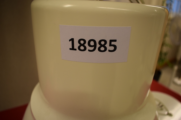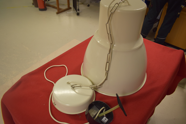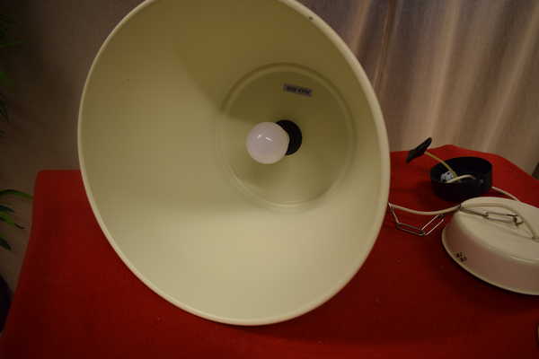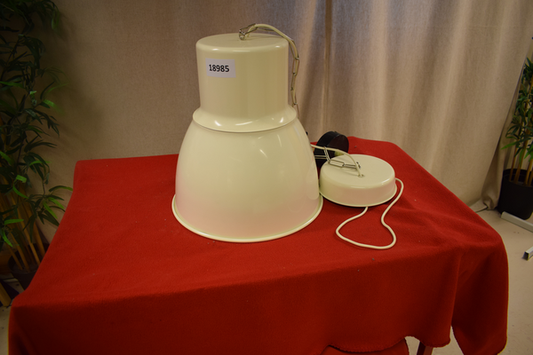 3 stora vita lampor i metall, med kedja för upphängning. Diameter 38, H40,5(lampan) H109(om man sträcker ut sladden.)