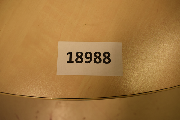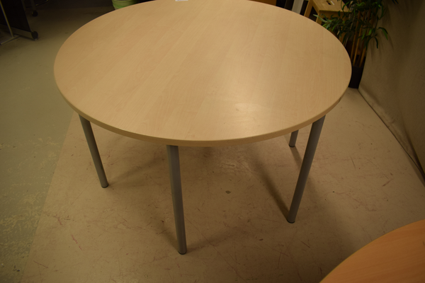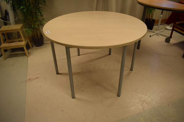Runt bord med träskiva, och med metallben. Finns märken och repor. Diameter 120, H73.