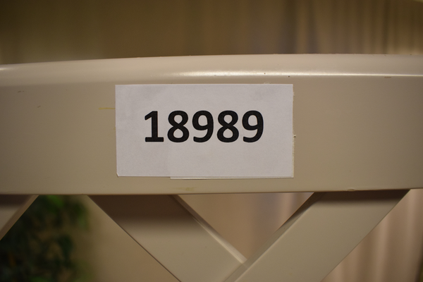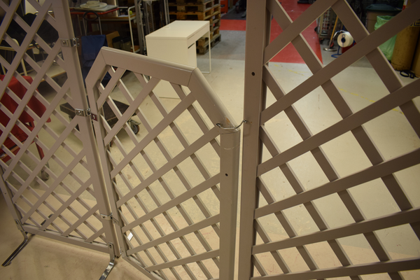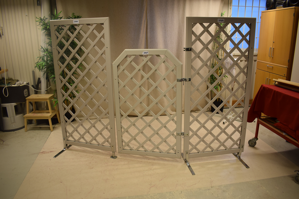 Grind/väggavskiljare i trä med metallfötter. Finns en liten hasp på dörren. Gråfärgad. D47(fötter), B205, H158,