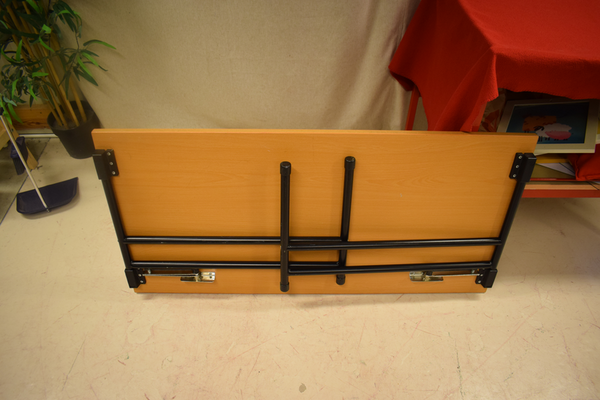 Ihopfällbart träbord med metallben. D60, B120, H73.