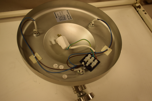 Taklampa med 3 stickkontakt lysen. 1 lampa saknas, men det fungerar om man sätter en ny lampa där. Ø25, H15.