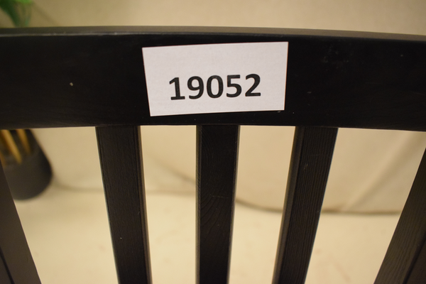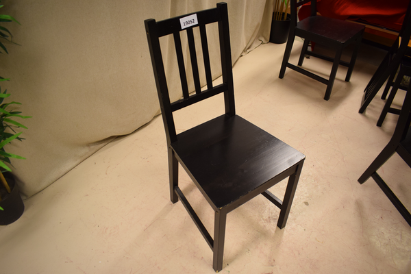 Svart stol i trä med lägre sits, IKEA Stefan. Finns repor och märken. D:45, B:41,5, H:89,5, H(sitt):45.