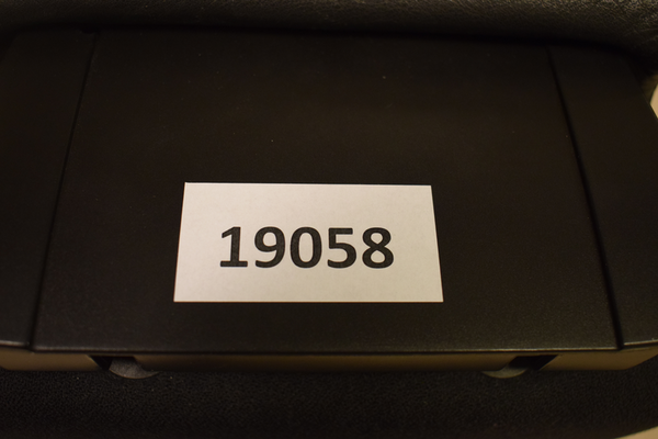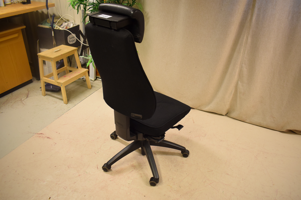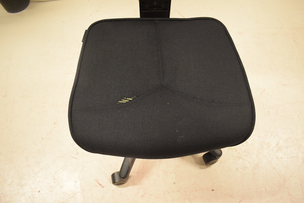 Svart kontorsstol i tyg. Höj- och sänkbar. Sitsen är lite sliten med en reva samt lite seg att höja. D:54, B:55, H(högsta):118, H(sitt):57,5,/45.