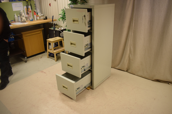 LÅsbart dokumentskåp i kassaskåps model. 4 utdrabara lådor och nyckel finns. D:56,5, B:47, H:134,5