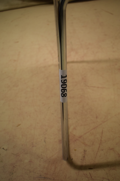Röd tygstol med metallben. Finns fläckar. D:48, B:63, H:85,5, H(sitt):44.
