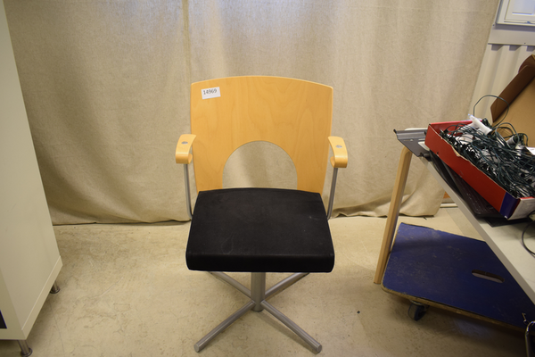 Trästol med svart sits. Höj- och sänkmekanism sönder. Vridbar och återgår till framåtriktad position. Sitthöjd: 48 H:85 B:47 D:42