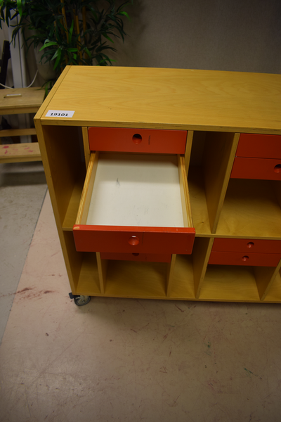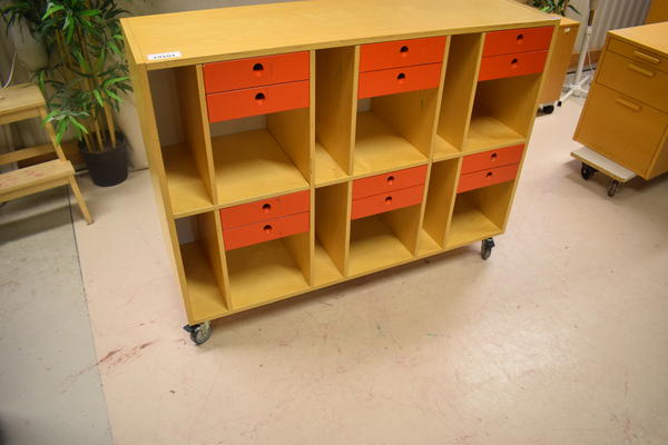 Trähylla med 12 hyllor och 12 lådor. H:89 B:118 D:39