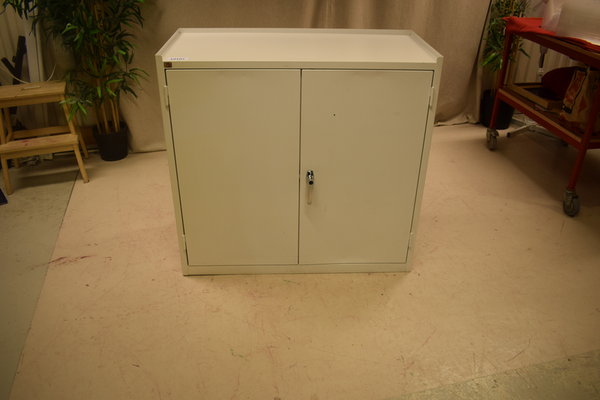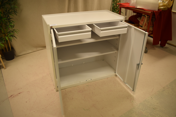 Vit plåtskåp utan lås. 3 hyllplan och 2 lådor. H:90 B:95 D:50