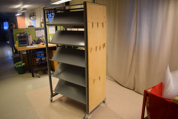 Bok/tidningsställ i metall med träsida. Går att rulla på låsbara hjul. H:183 B:97 D:55